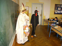 | "Najveće iznenađenje" bilo je što je kao i uvijek uz svetoga Nikolu bilo i ono nakazno biće - Krampus! Ma nema veze, kostimi su već "izlizani", "face" iz viših razreda svi su prepoznali, ali ipak je to bilo "prvorazredno iznenađenje", jer slatkom poklonu se ne gleda u zube! Svi smo bili mali, svi smo vjerovali, svi smo spoznali, ali ono što je i sada konstanta - svi mi i dan danas, ma koliko god stari bili volimo biti darivani i sjećati se starih dobrih hrvatskih i katoličkih običaja. Sveti Nikola dođi nam i dogodine! Da, i hvala ti na poklonima! | |