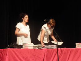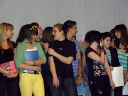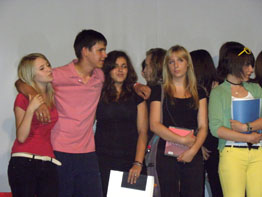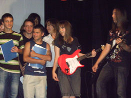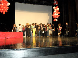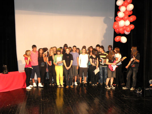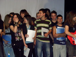 | Kako su učenice i učenici primali svjedodžbe tako su zauzimali svoje mjesto na bini, a bina se pak polako popunjavala. Na kraju kada su se svi skupili izveli su zajedničku točku uz glazbenu pratnju na dvije gitare. Sve je prštalo od sreće, mladosti, pjesme, smjeha, ali i emocije su bile toliko snažne da su se miješale suze radosnice s onima drugima koje su polako pokazivale "žal" za završenim vremenom zajedništva, druženja i dugogodišnjeg zajedničkog života. Zato vam svi želimo- osmaši sretno!!! | ![]() |