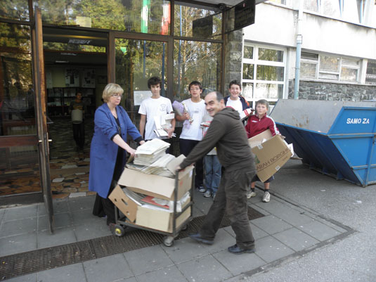 | Da nismo EKO - škola samo na papiru dokazujemo svake godine kada se aktivno uključujemo u sakupljanje sekundarnih sirovina, prije svega - staroga papira. Mora se priznati da se osim organiziranja akcije u nju uključuju svi učitelji i učenici naše škole marljivo noseći tijekom godine papir u školu. Posebno nekoliko dana prije "same isporuke" - uredno se počiste svi školski ormari, učionice i ostale prostorije škole. Tek tada kada smo spremni za isporuku dolazi kontejner u kojega se ubacuje stari papir. Da posao nije nimalo lagan dokazuje nam i to što učenici - aktivisti redovno mole tete čistačice i domara da im pomognu u ubacivanju "tereta", a često se dovozi i više spremnika, jer ne stane sve u jedan. Koliko smo sakupili? Nećemo se hvaliti, ali možemo reći - dosta, čak i jako puno! |