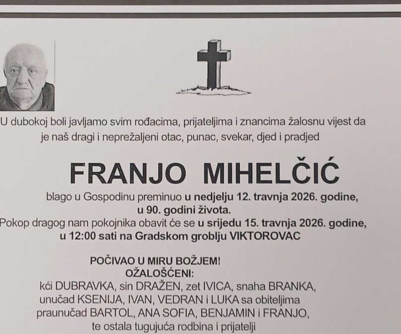 S velikom tugom i dubokim poštovanjem javljamo kolegama, bivšim zaposlenicima i prijateljima škole da nas je napustio naš dugogodišnji i poštovani umirovljeni ravnatelj, FRANJO MIHELČIĆ (1936. – 2026.).